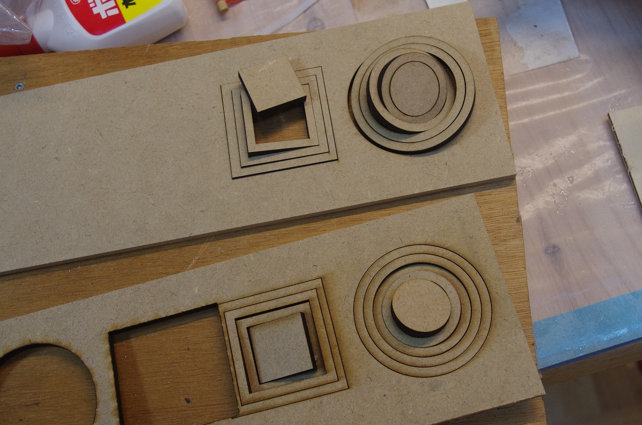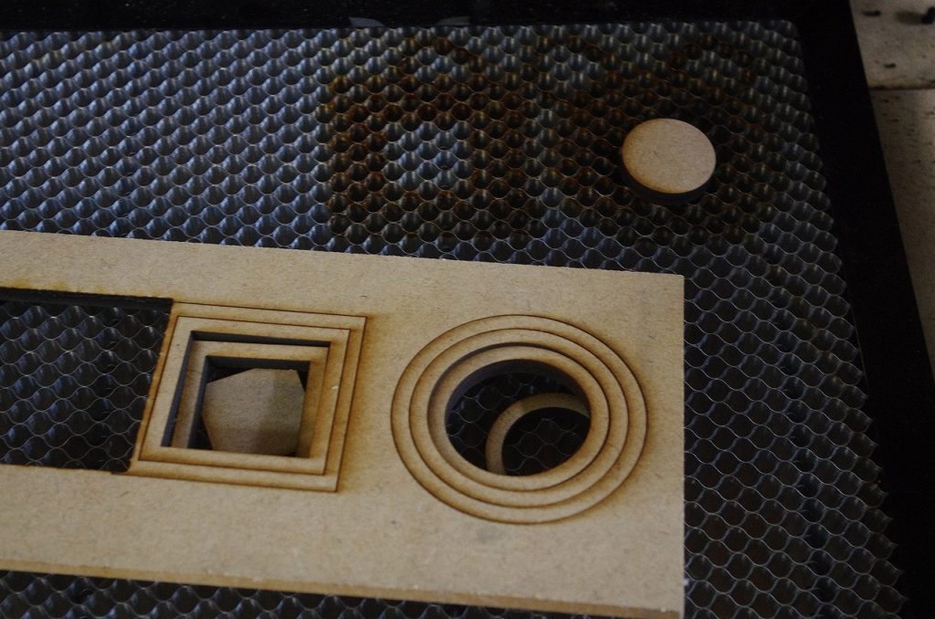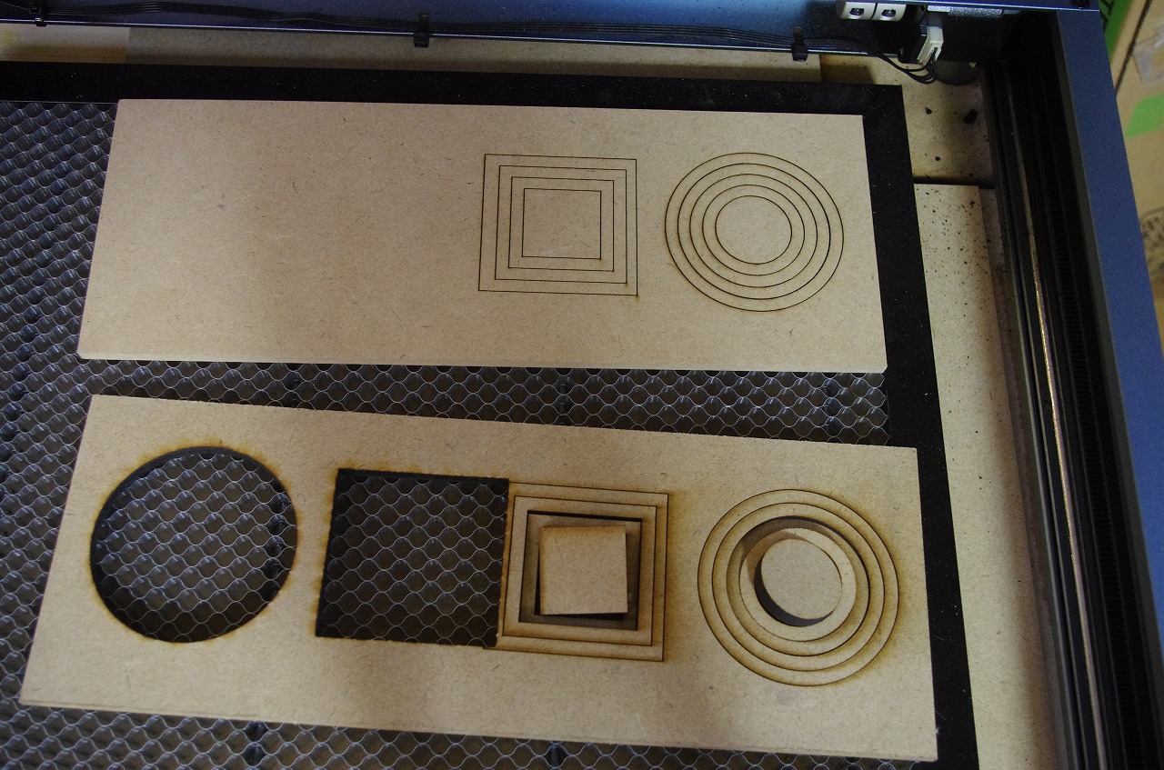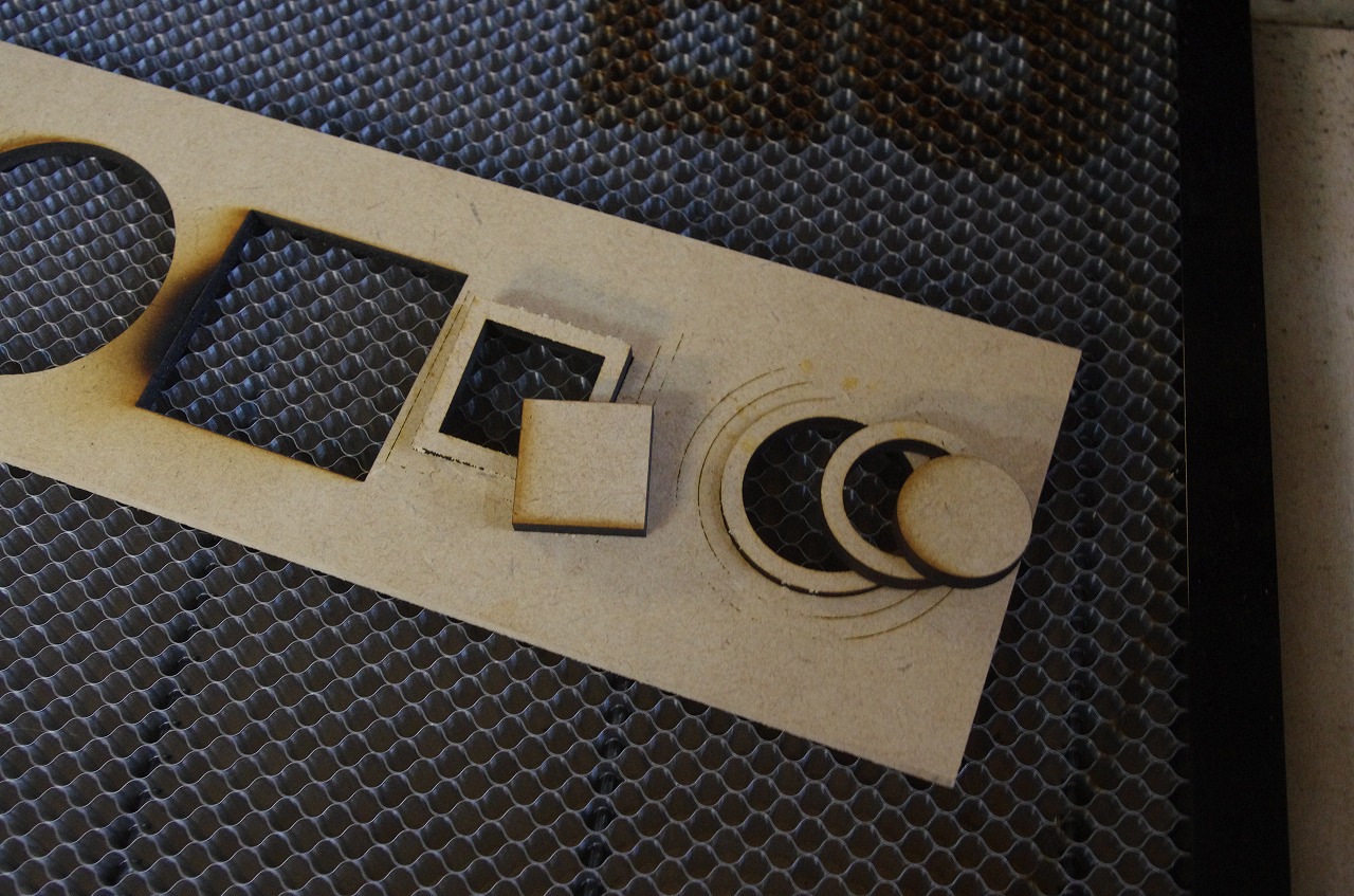 そして、写真ではわかりにくいが、エア・アシストを使ってカットしたものはMDF板を持ち上げても切り抜いたパーツがついてくる。エア・アシストなしだとゆっくりカットしたものだと力を加えなくともパーツが落ちることもしばしばだ。