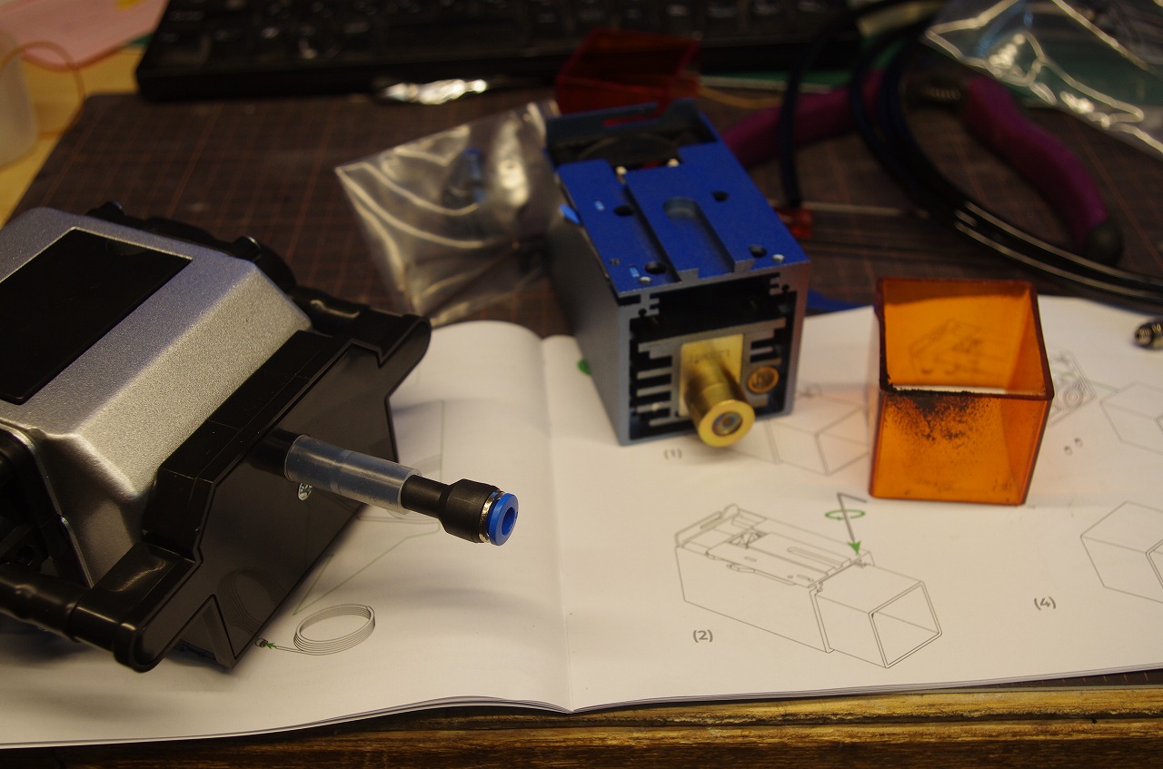 いわゆるエア・アシストだ。レーザーが当たるところに空気を吹き付けて煙やら炭化したカスなどを吹き飛ばすものらしい。これでレーザーカッターとしての能力がアップするのか疑わしいとも思えたのだが、焦げ付きややヤニの汚れが低減できるのならと導入してみた。