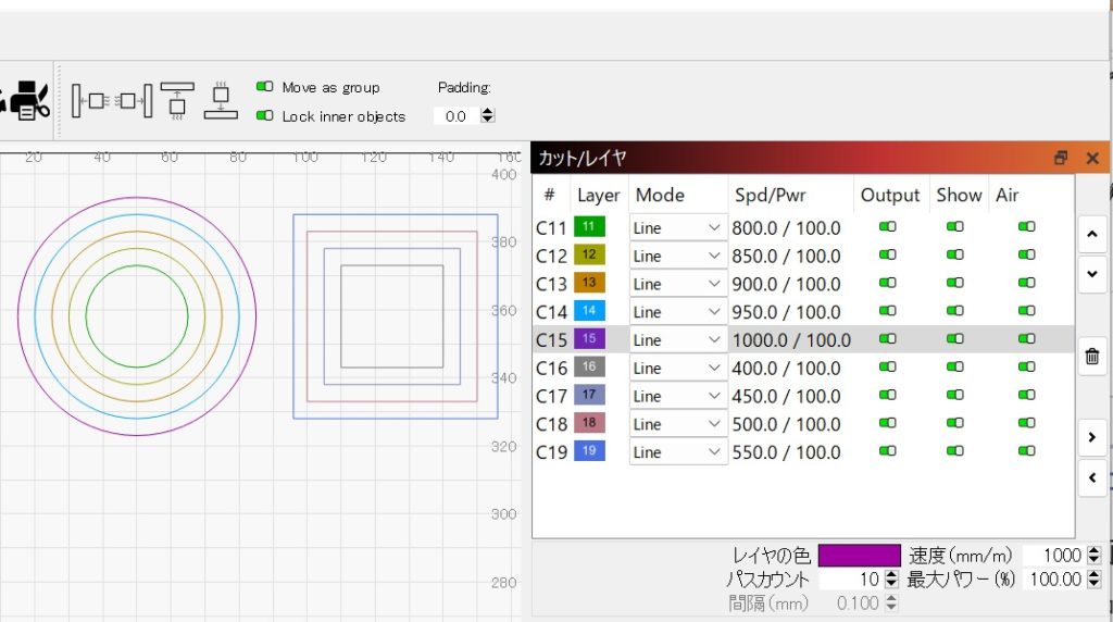 ダイソーMDFの品質差によるかもしれないので、念のために同じ材料の隣にエア・アシストを切って切り抜いてみる。