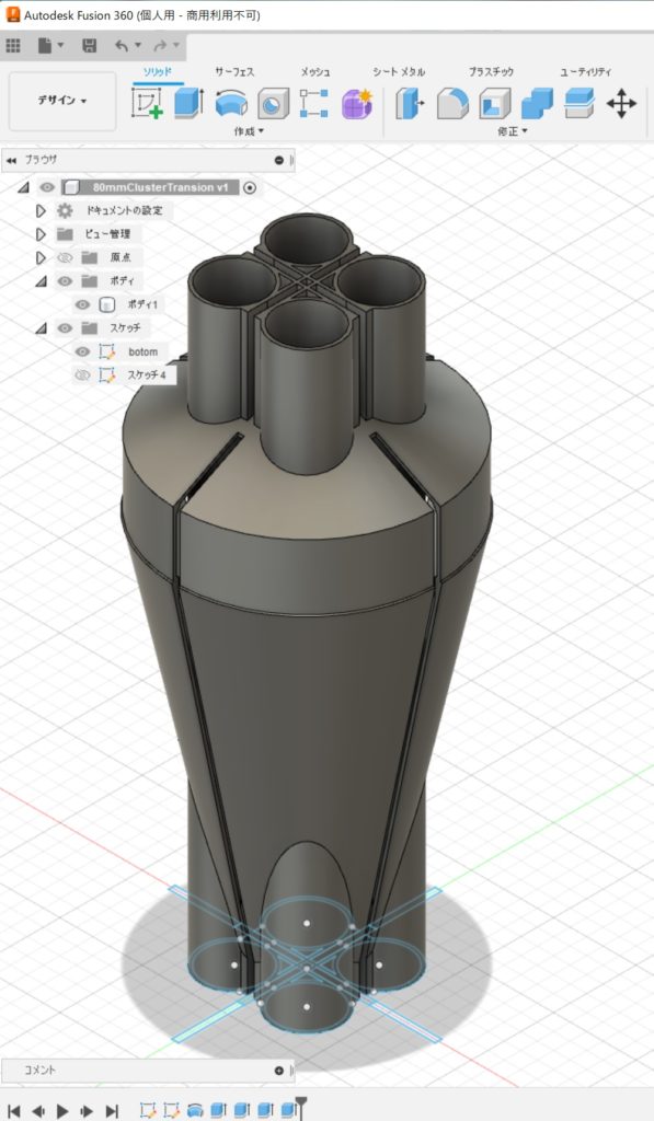 少しでも大きいロケットを飛ばしたいと思ったら一番下をすぼめる形にすることで空気抵抗を減らせるというので、そのあたりも含め、エンジンマウントとフィンの結合などと一体型で設計した。