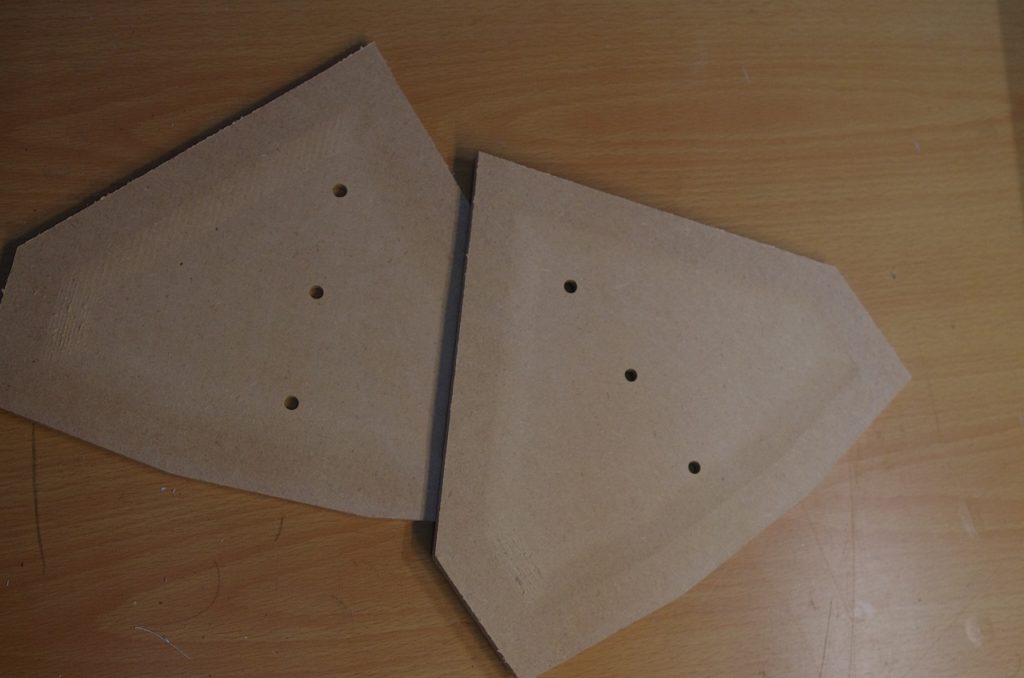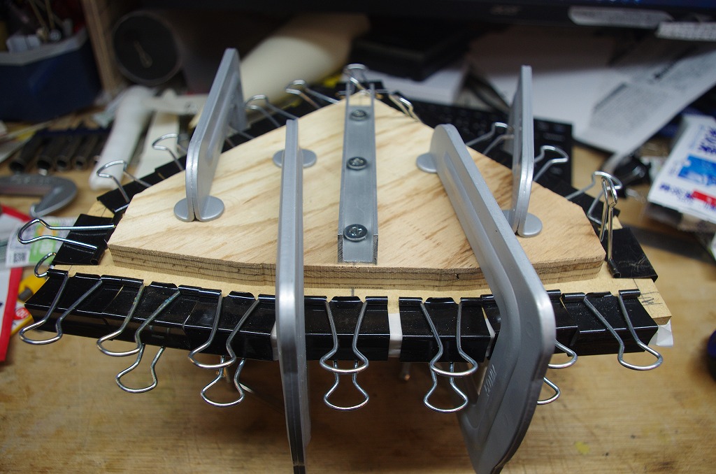 6㎜のダイソーMDFでは周囲だけではどうしても中央部の密着ができないので穴をあけて5㎜ボルトで絞めつけてやった。それでも翼端付近が浮いていたのでC型クランプで挟む。