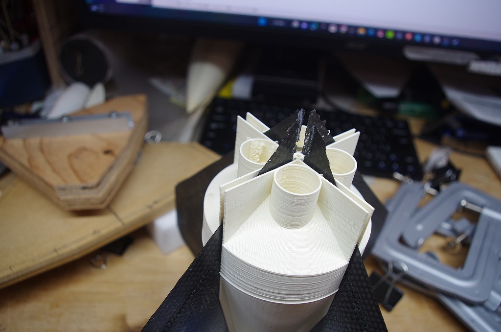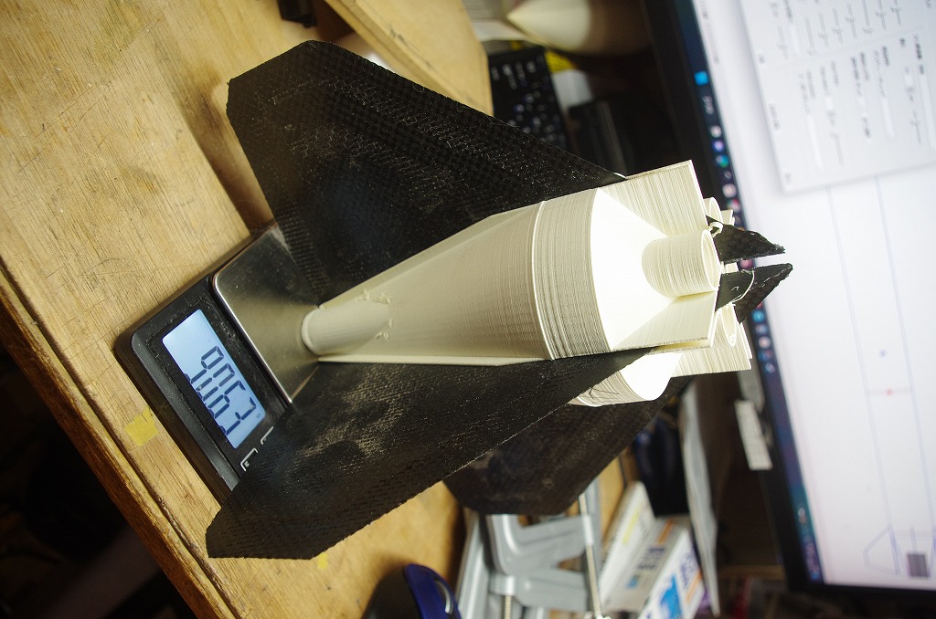 円錐形のボートテールと円筒形のエンジンマウントと平面のフィンを厚紙やカーボンで作るのはなかなか難儀をするのだが、3Dプリンタを使えば簡単。