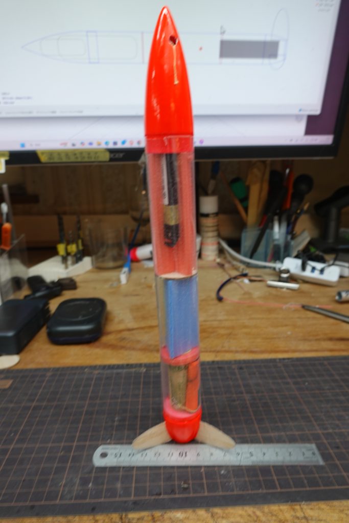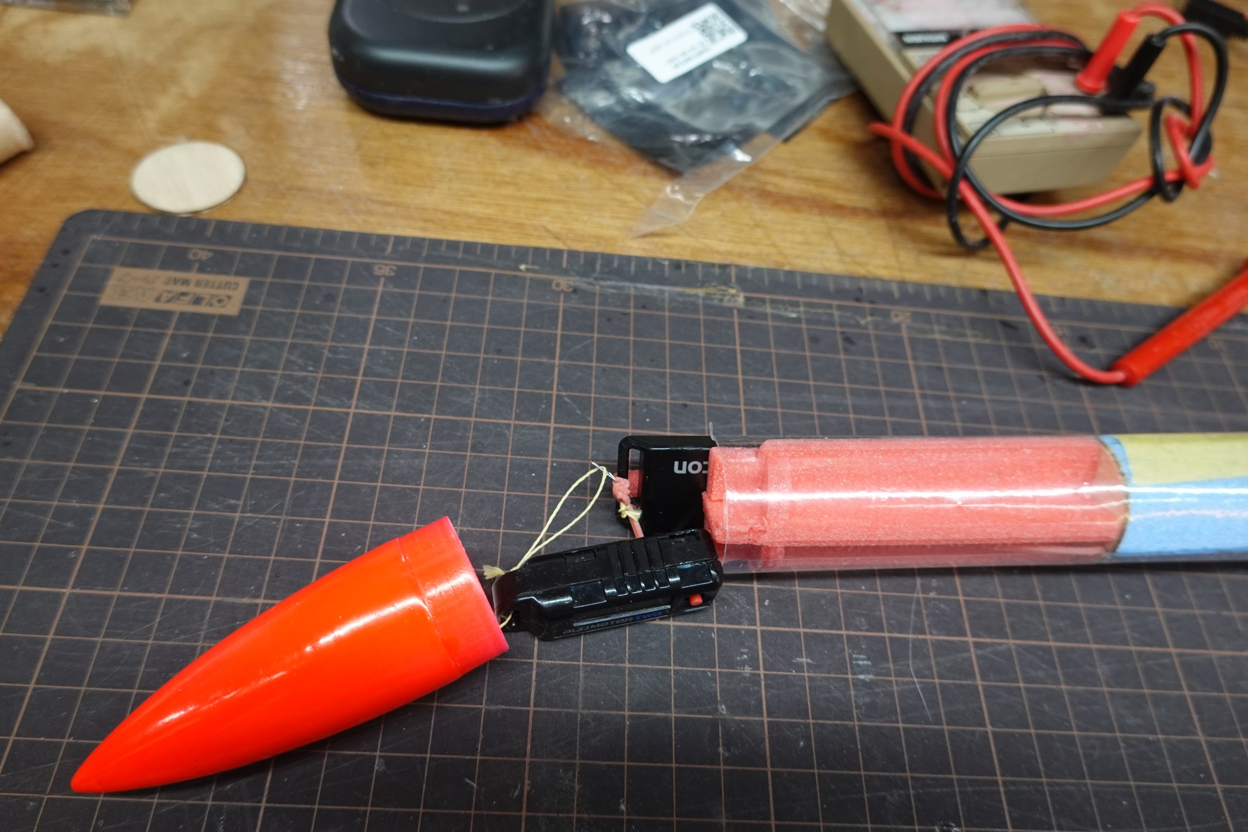 今回の改善点の一つがビーコンと高度計を一部オーバーラップして格納する仕組み。ダイソーの6㎜スチレンボードが固定具を作って確実に保持できるようにしている。