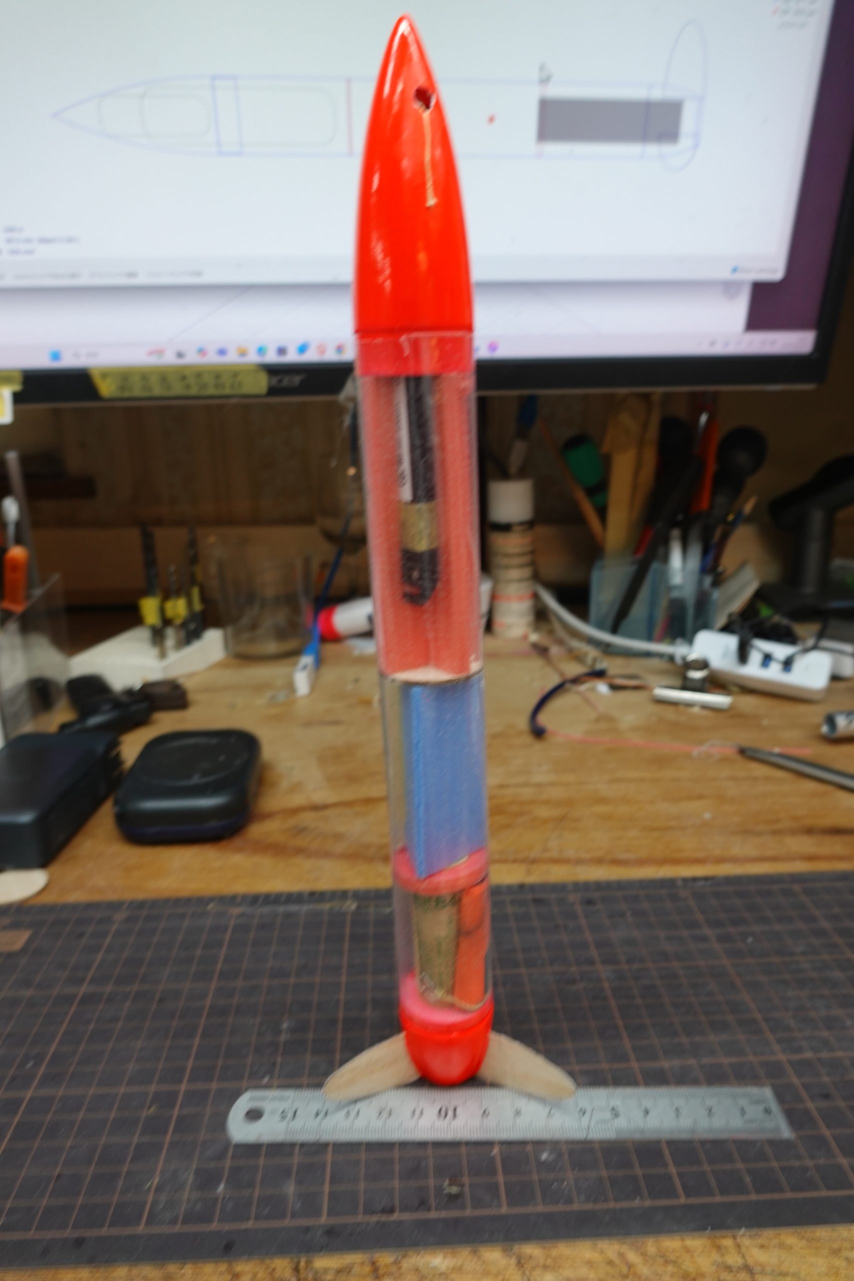 これまではボートテール部の周辺部で機体全体の重量を支える形だったが、2㎜スチレンボードの三角柱でペイロードで支える形にした。