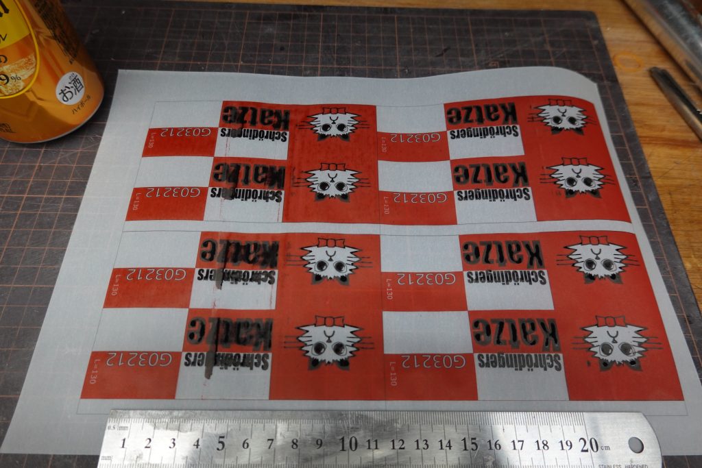 これにデザインを印刷。コピー用紙用のデータでそのまま印刷。これが厄介なことにインクの湿度でトレペが丸まってしまう。うまいタイミングで引きずり出してやろうと試みるも、A41枚に4機分印刷されるはずが後半2機分がプリンタの出口にこすれて汚れてしまった。