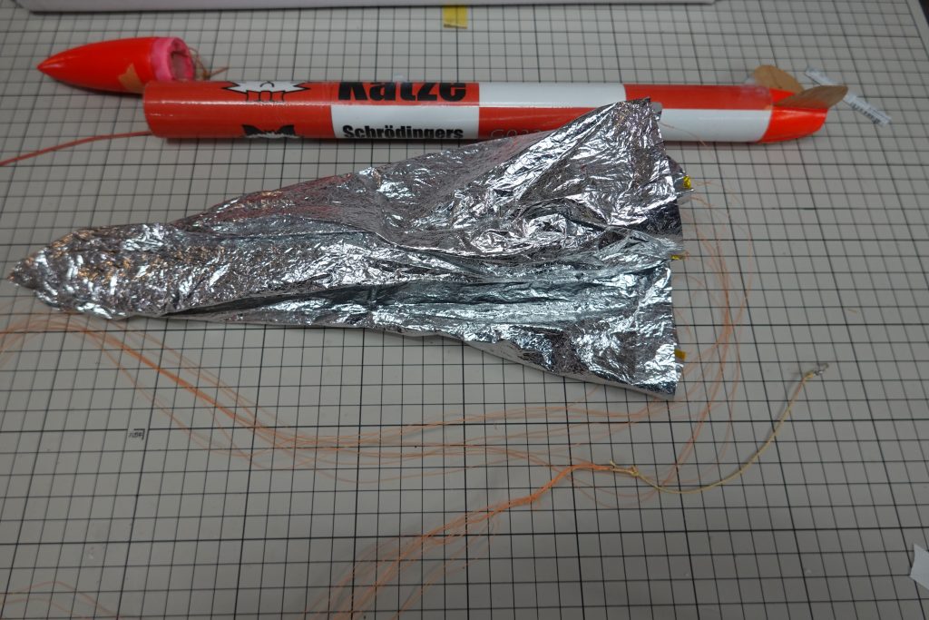 種コン機体だと高度を上げすぎると制限範囲内に落とすのが難しくなるので敢えて高度が出ないサイズにしてある。サイズの拡大は大きなパラシュートを無理なく収納できるというメリットもある。今回のパラシュートは防災シート用のアルミ蒸着フィルムを使った。30㎜というボディの太さは25㎜と比べてパラシュートの格納を容易にしてくれるのは間違いない。