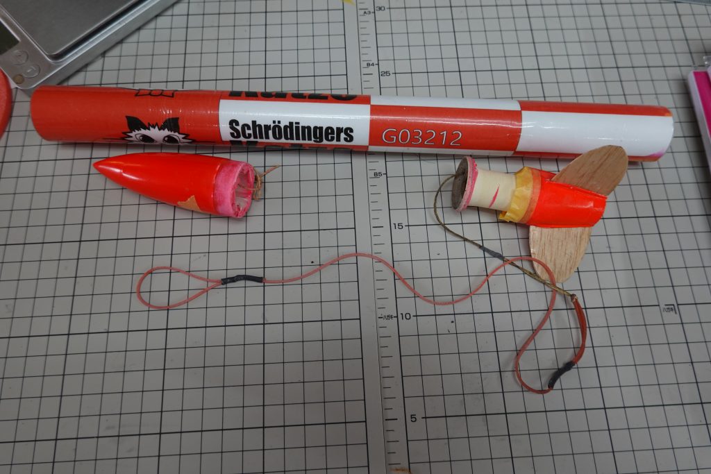 この競技の時、機体分離の失格が時折みられるが、ショックコードを伸縮性の無いもののみで構成するとこれが切れてしまったり、機体やノーズコーンの接続部が破損したりという事故が増えるものと考えている。ショックコードが切れなくとも、ショックが集中するほかのパーツとの接続部分の剥がれや破損を招く可能性は高いだろう。モデルロケット競技歴の長い先輩たちの中にはケブラー糸のみのショックコードを使う人も多いが、たくさんの経験値の積み重ね(逆噴射の火炎の当たり方や逆噴射の強さのばらつき、パーツ強度や接着強度の確保など、考慮に入れなくてはならない要素は無限にある)。私の場合は紙飛行機のカタパルト用に売られている通称「赤ゴム」を」愛用している。ゴム動力飛行機用に売られている「TANゴム」なら様々な太さのものが売られているのでそちらから選んでもよいだろう。