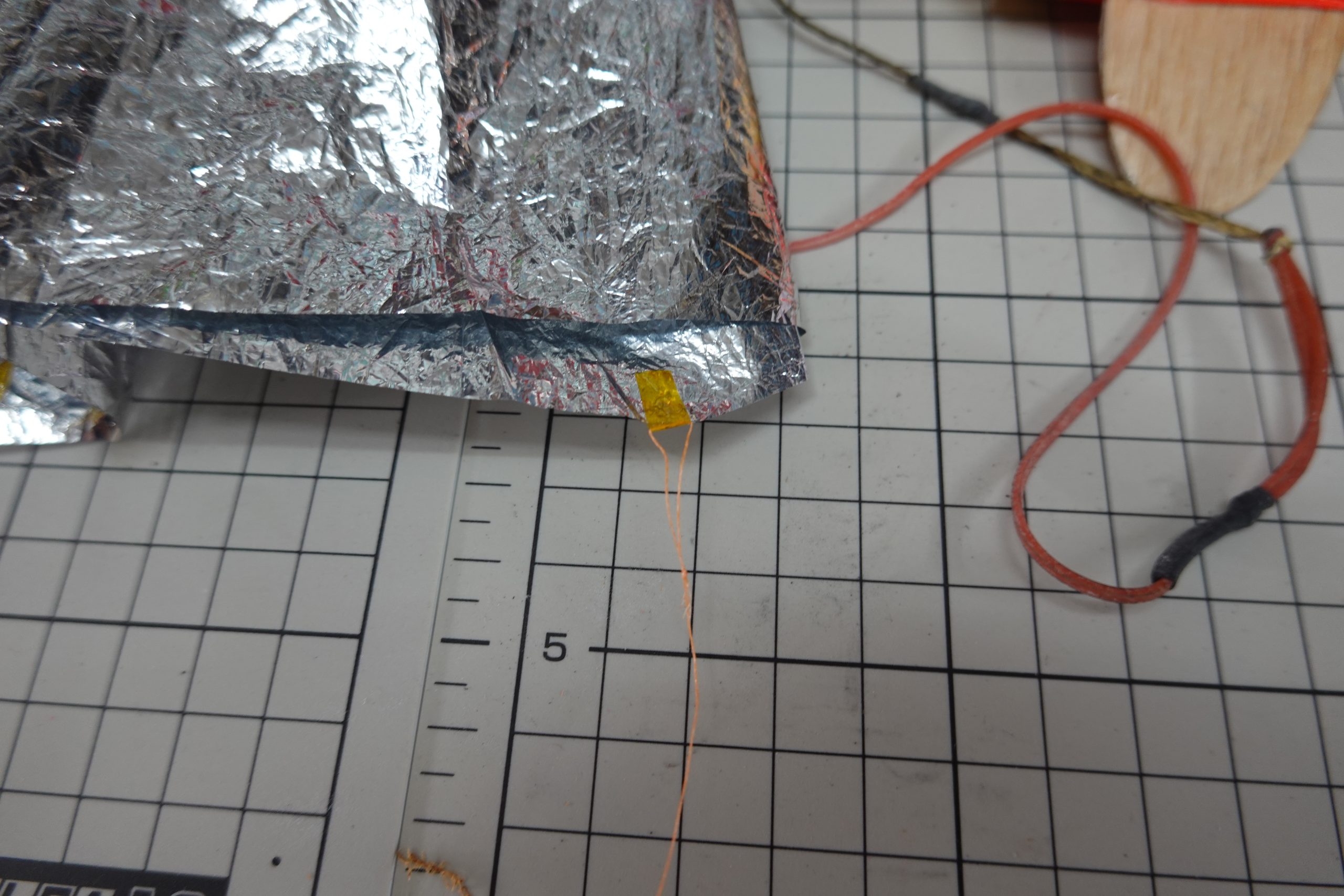 なお、パラシュート本体にシュラウドラインの取り付けはこんな感じ。ラインに輪を作りそれに通したカプトンテープでフィルムを表と裏から挟む感じで張り付けている。