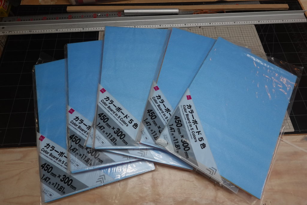 ダイソーのカラーボード2㎜(300㎜×400㎜5色セットで110円)。何より優れているのは軽さ。比重は画材店などで売られているスチレンペーパーの半分くらいしかなく、面積当たりの重さならちょっと厚手のコピー紙程度しかない。これは我が家では何十セットかストックしてある物を使う。実物のボディチューブはアビオ部:グラスFRP、タンクやエンジン部:カーボンFRPを予定しているので、それぞれ白のスチレンボードと黒のスチレンボードを使うことにする。