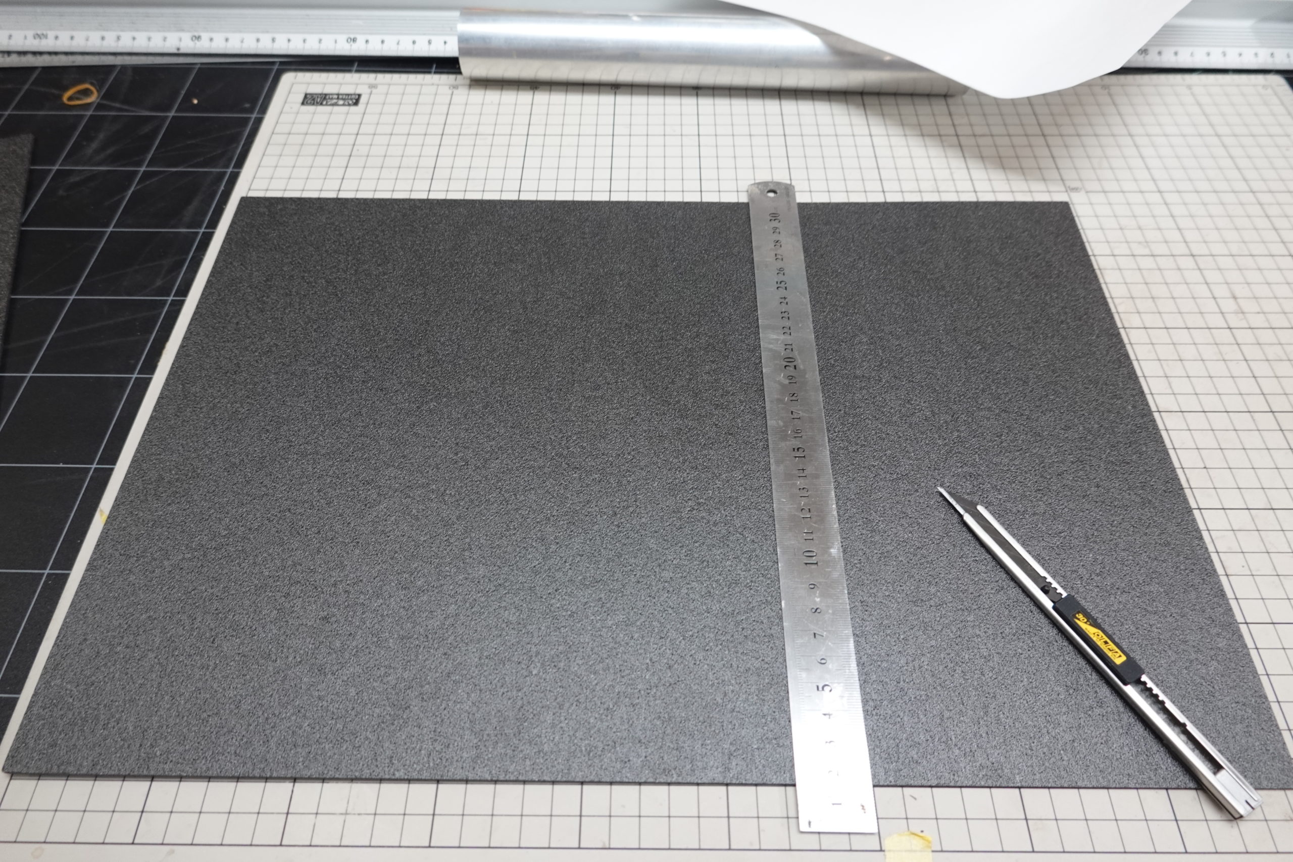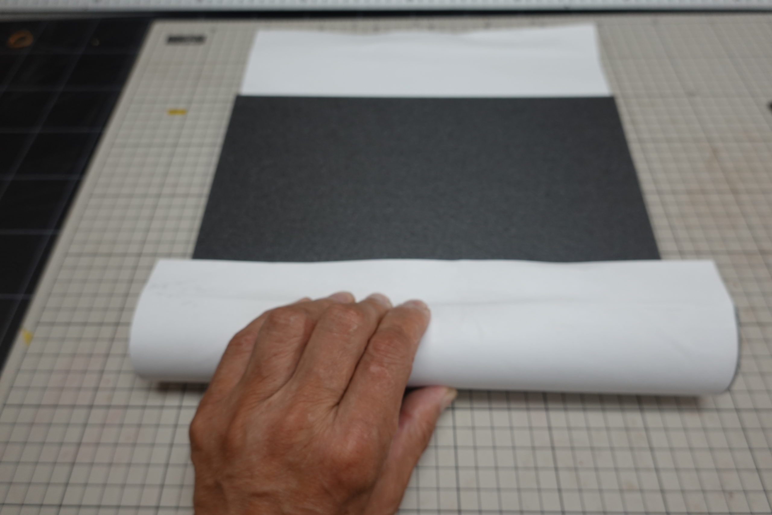 まず、ちょっと厚手のA3コピー紙を下に敷き、そのコピー紙が数センチはみ出すようにスチレンペーパーを置く。更にその縁近くに大きめの芯材、今回は最終的なマンドレルとしても使う90㎜のアルミパイプ(横山デクノより購入)を使用する。そこで下のコピー紙ごと持ち上げ、パイプに密着させながら巻き付けていく。とにかく密着させることが重要で、隙間ができるとその隙間で割れてしまう。慎重に1回巻き付けたらまた隙間を作らないようにそっと開放してやる。念のため奥側と手前側を入れ替えてもう一度巻いてみゅるめる。これで軽く癖がついて状態になる。