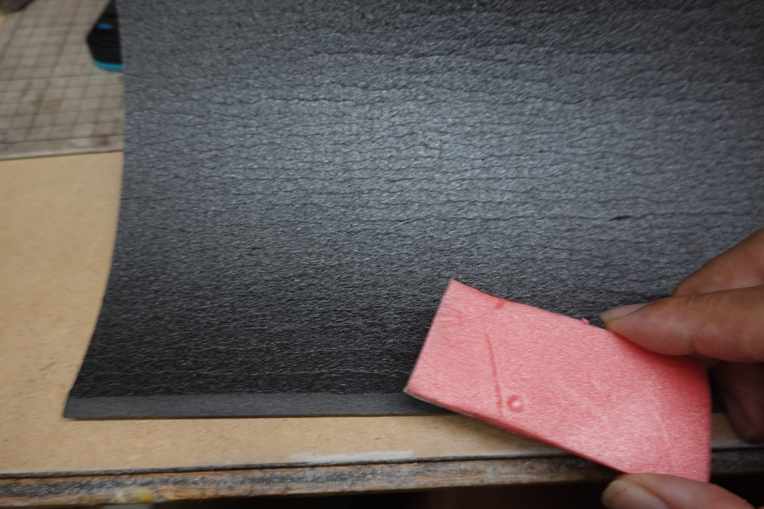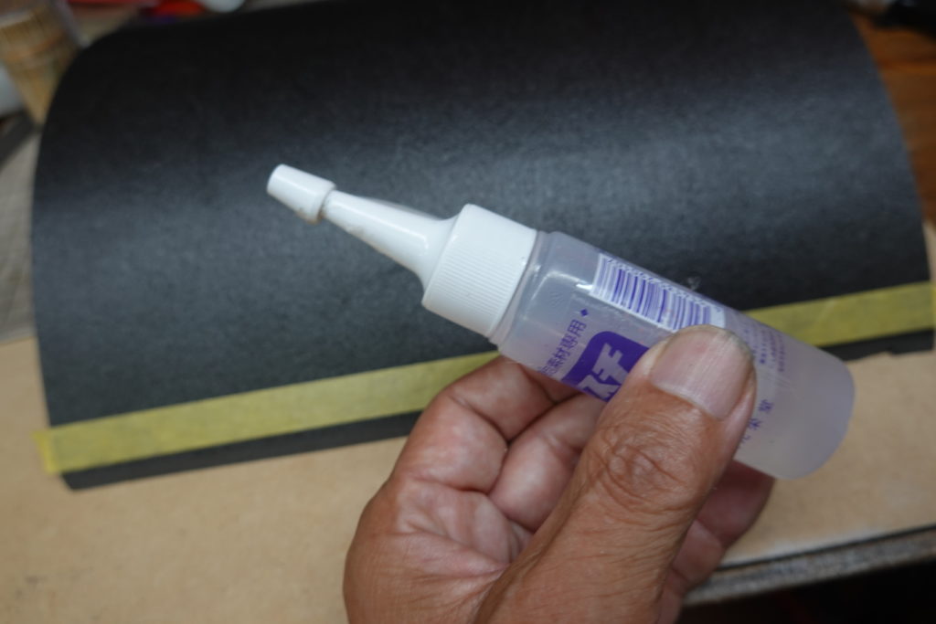 張り合わせるときにはのりしろに「スチのり」を使うが、普通に貼っては段差が大きすぎる。のりしろの端の厚みが無くなる程度に斜めに紙やすりをかけてやると、段差を少なくできる。このヤスリがけでの厚み調整を丁寧にやってやればどこがのりしろだったかわからないようにだってできるかもしれないが、私にはそんな几帳面さはない。切り口が目立たなくなればいいや位のところにとどめている。