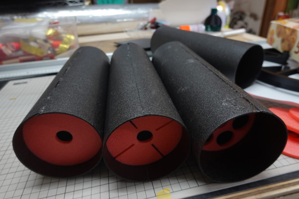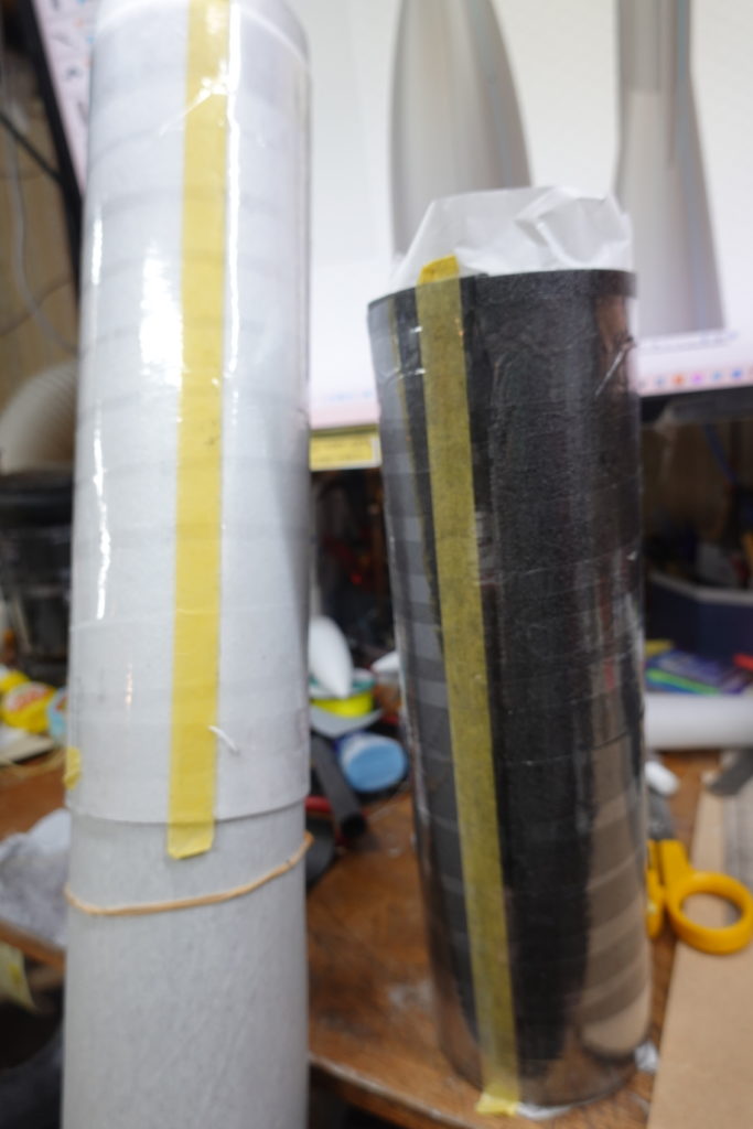 長方形のスチレンボードを長辺方向を上下方向に使えば継ぎ目を少なく、材料の無駄も減るのだが、このスチレンボードは紙でいえば「T目」となるような剛性の強弱がある。これを丸めるには短辺が上下方向になるように使わなくてはならず、ボディチューブを30㎝ずつに分割してつくらねばならない。そして芯に使うのは90㎜のパイプ。円周方向の長さは