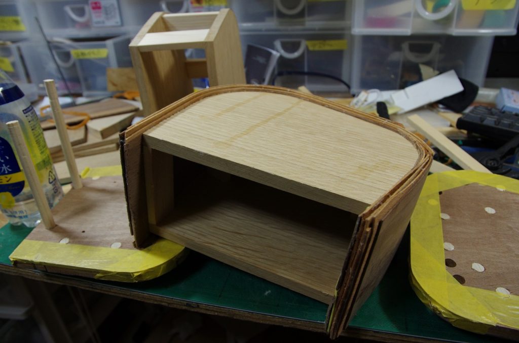 天板から背板、底板までを1.5㎜ウォルナットと1.2㎜のバーチを積層して曲げてつないだ形にする。