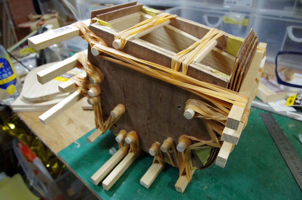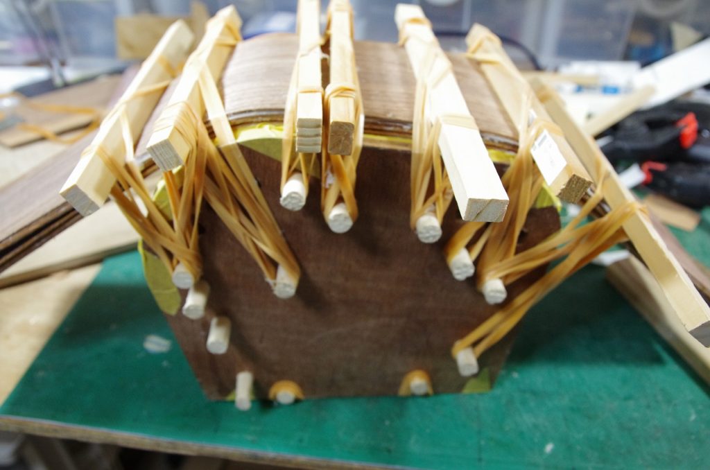 で、この丸棒に大きな輪ゴムをかけてロータリー単板を押し付けていく。今回は背面を最初に固定してから、天板と底板に回り込ませることにした。