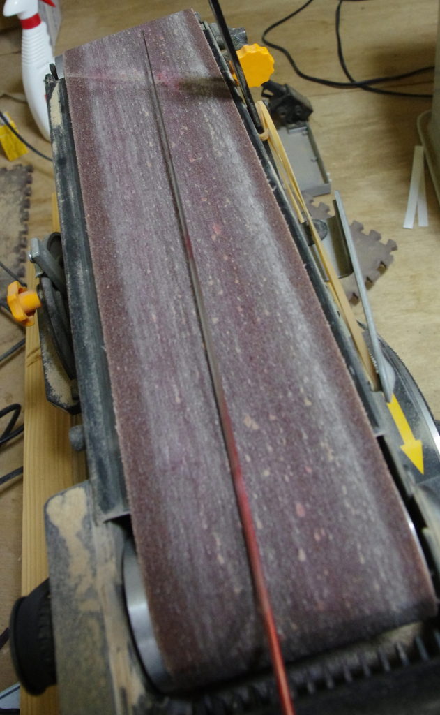 一通り、赤い部分がなくなるまで削ったら、もう一度全体を赤く塗り直してから軽くベルトサンダを当てて、細い部分が残っていないか確かめる。